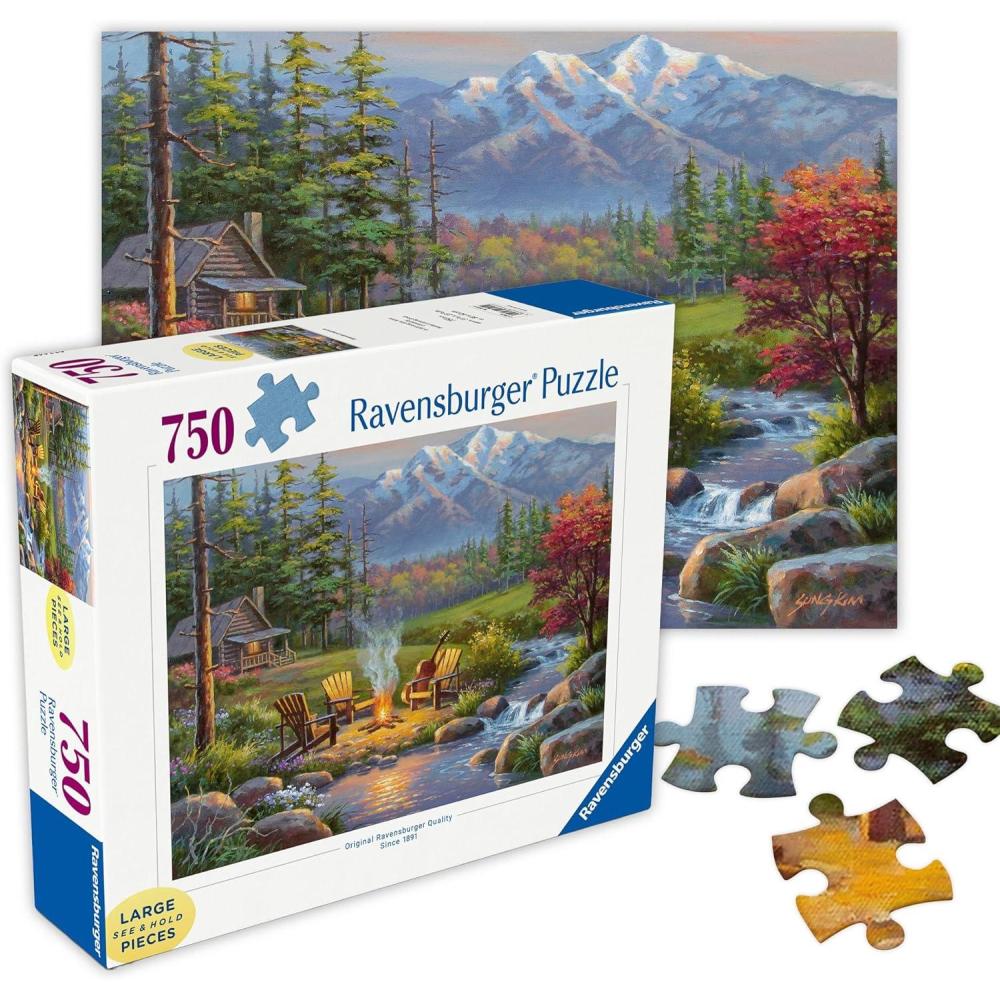 Ravensburger – Riverside Livingroom – 750 Piece Large Format Jigsaw Puzzle – Serene Vision of a Rustic Cabin, Mountains & Stream – Frameable – Premium Quality – Puzzles for Adults